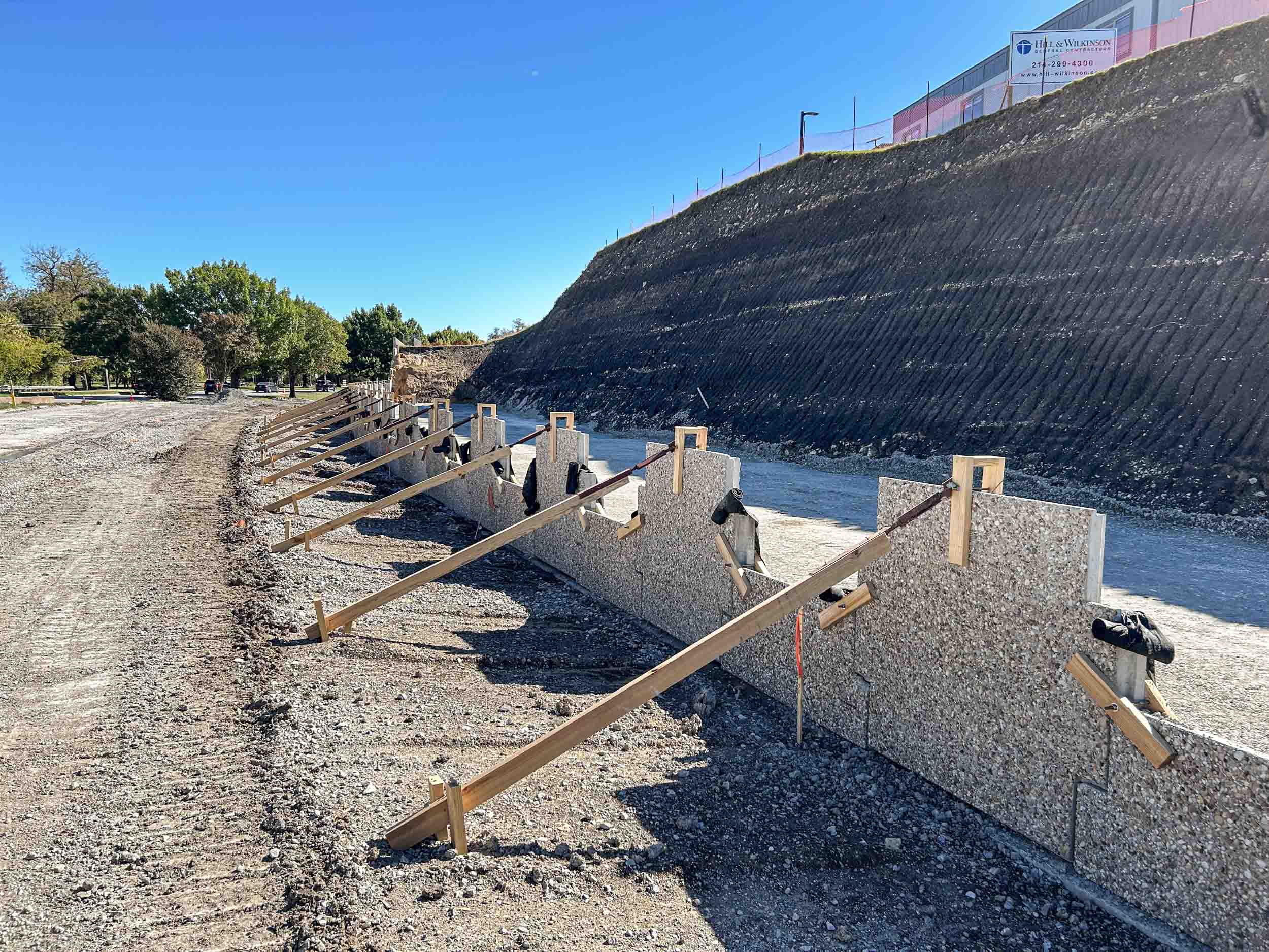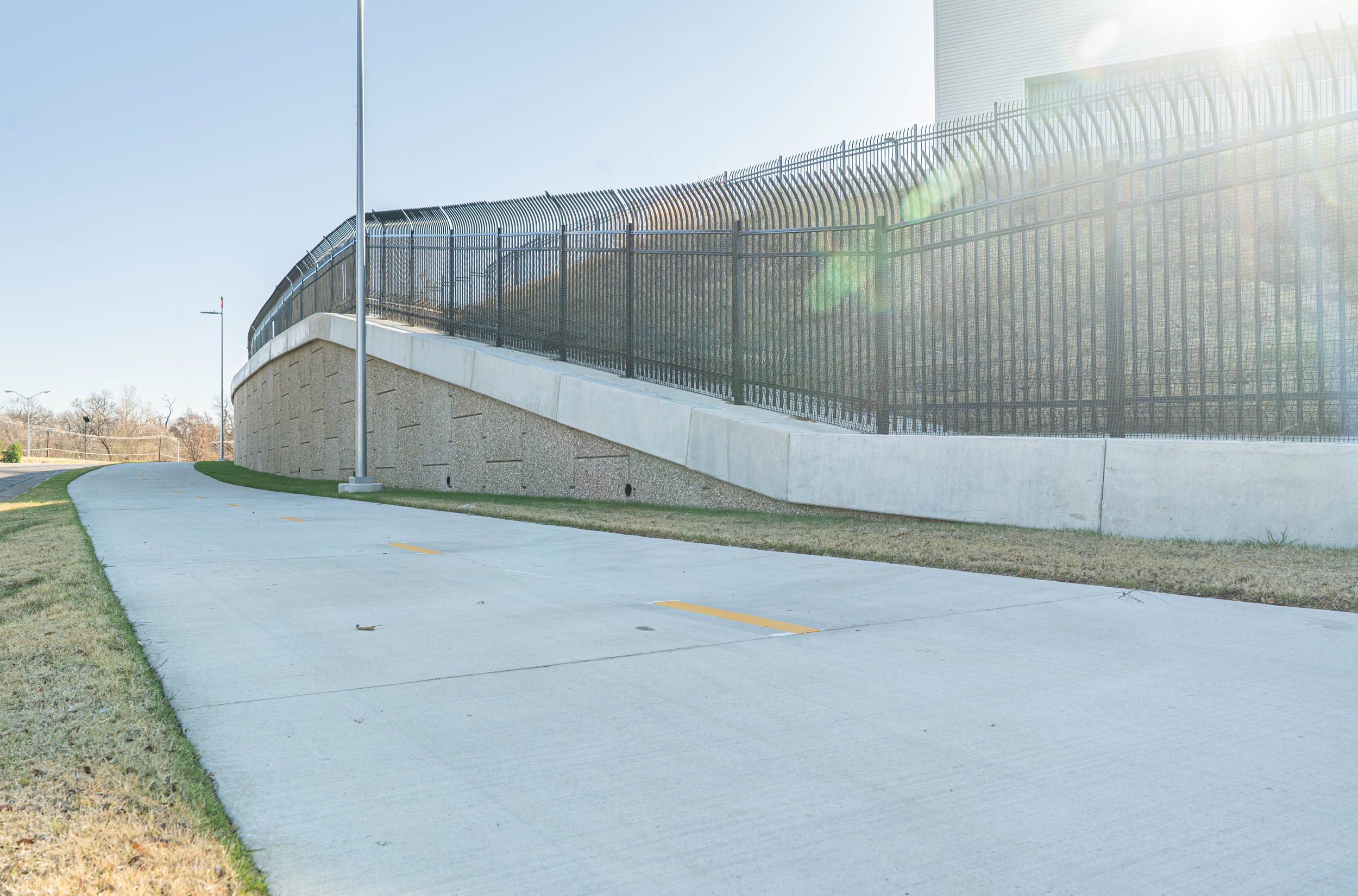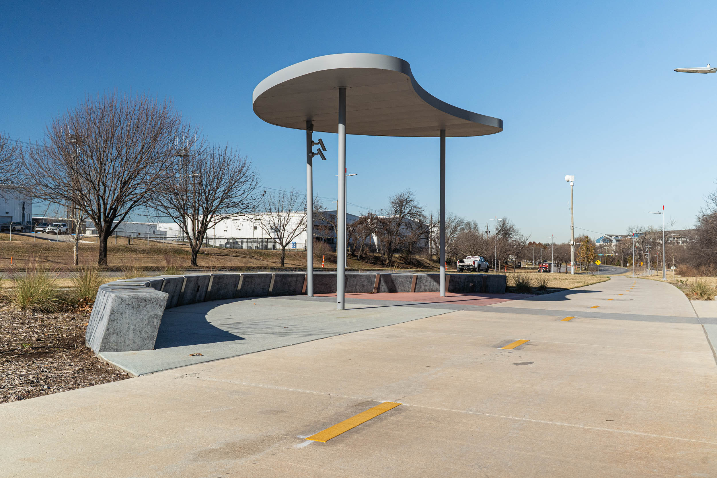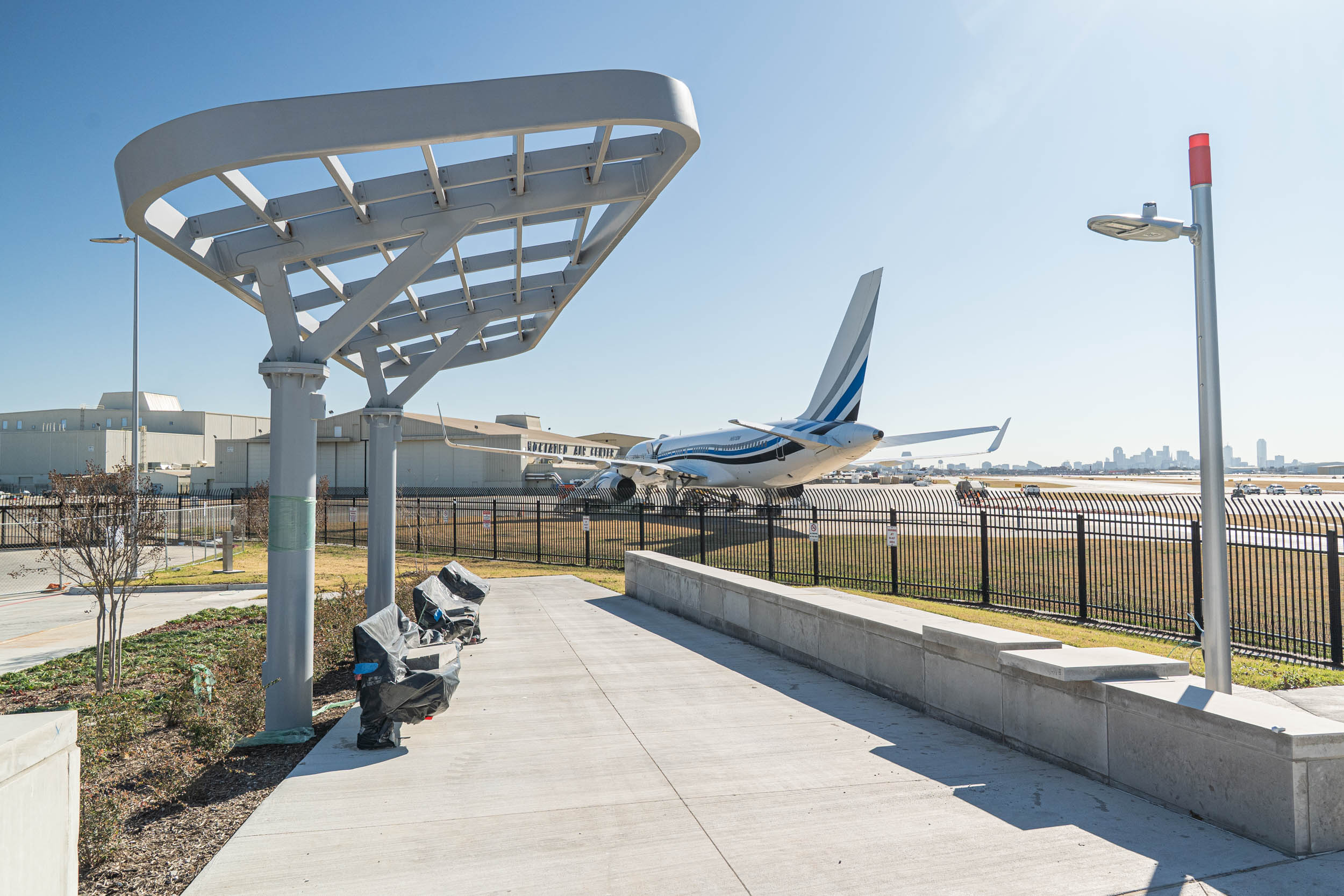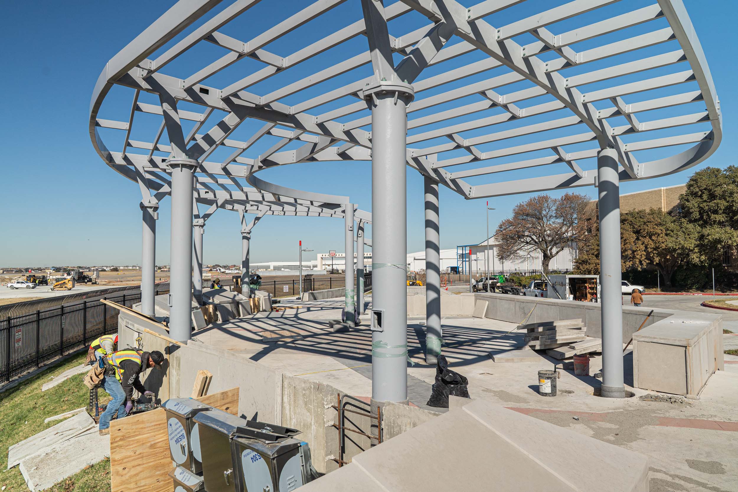 The Lemmon Avenue Streetscape Enhancements project, delivered in partnership with the City of Dallas and the Department of Aviation, is the most comprehensive project in RoeschCo’s portfolio to date. The work spans 2.5 miles along Lemmon Avenue between Bachman Lake and Mockingbird Lane and includes a continuous hike and bike trail system supported by major infrastructure and public space improvements. The centerpiece of the project is the George Coker Aircraft Observation Deck, a landmark public destination adjacent to Dallas Love Field. This feature includes custom steel shade canopies with internally lit polycarbonate and perforated aluminum roofing, limestone clad walls, granite paving, integrated viewing elements, site furnishings, and a custom airport monument sign. Supporting work included new parking, roadway improvements, drainage, landscaping, and irrigation. A significant portion of the scope involved the relocation and expansion of approximately 8,700 square feet of MSE wall within FAA property along Shorecrest Drive. Construction required innovation of extensive dewatering using a double wellpoint system due to shallow groundwater conditions. Additional improvements included the complete revitalization of Midway Manor Park with new playgrounds, a custom basketball court developed in partnership with the Dallas Mavericks, custom concrete seatwalls, steel shade canopies, and fully irrigated landscaping. At the southern end of the corridor, the Primary Gateway included reconstruction of the Love Field runway approach and installation of approximately half a mile of integrally colored concrete retaining wall with custom aluminum fascia panels and architectural backlighting. Across the corridor, trail improvements included more than 250 new street lights, replacement of three signalized intersections, seven trail respite areas with shade canopies and seatwalls, and more than 17 acres of hardscape and landscaped areas, delivering a highly visible and durable public infrastructure corridor.